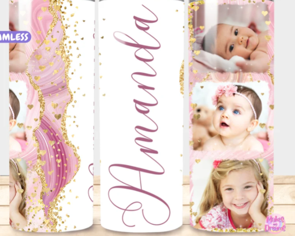 Your photos of your beautiful loved ones are going to make this design, in shades of pink, gold, and silver even more adorable.